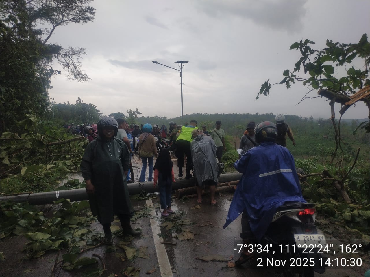 BLORA – Hujan lebat disertai angin puting beliung pada Minggu (02/11/2025) sekitar pukul 13.30 WIB di wilayah Banjarejo, Blora, menyebabkan bencana alam yang memutus akses jalan utama. Sebanyak dua tiang listrik roboh melintang di ruas Jalan Raya Banjarejo – Randublatung, tepatnya di Desa Sidomulyo, yang sontak menyebabkan kemacetan total arus lalu lintas.