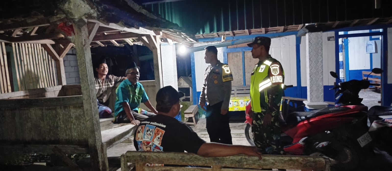 Bhabinkamtibmas dan Babinsa mendatangi Poskamling di RT 01 RW 03 Desa Cabean. Mereka mengapresiasi semangat gotong royong warga yang masih rutin melaksanakan ronda malam.