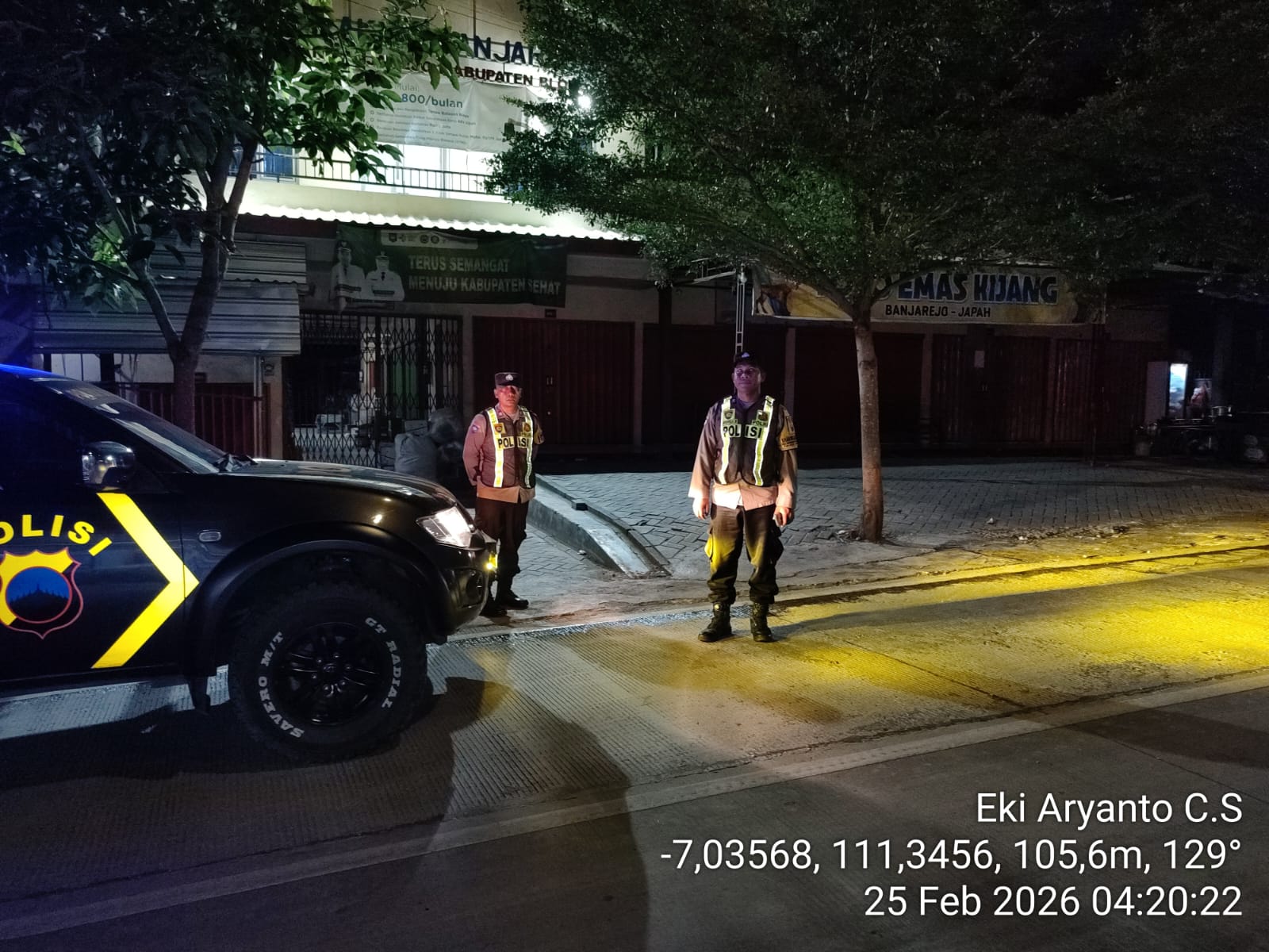 Patroli yang dimulai pukul 03.00 WIB ini dipimpin oleh Aiptu Sudarno bersama Aipda Eki C.S dan Brigpol Nyopiyadi. Dengan menggunakan mobil dinas Strada, petugas menyisir rute strategis mulai dari Masjid Baitunnur Banjarejo, Pasar Banjarejo, Pasar Mojowetan, hingga sepanjang jalan raya Banjarejo-Blora.
